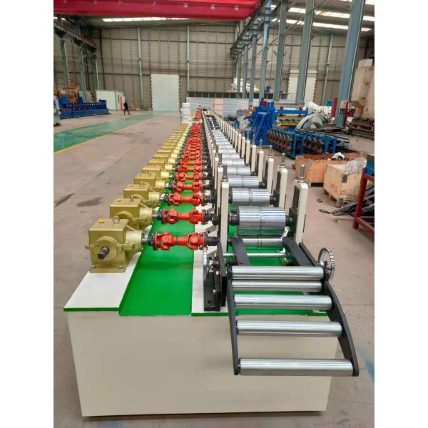 There are two different transmission and roll forming systems optional for a PU rolling shutter slat production line: economical type (chain-brackets transmission and conjoint-stands roll forming system) and upgraded type (gear-box & universal joint shafts transmission and separate-stands roll forming stands).